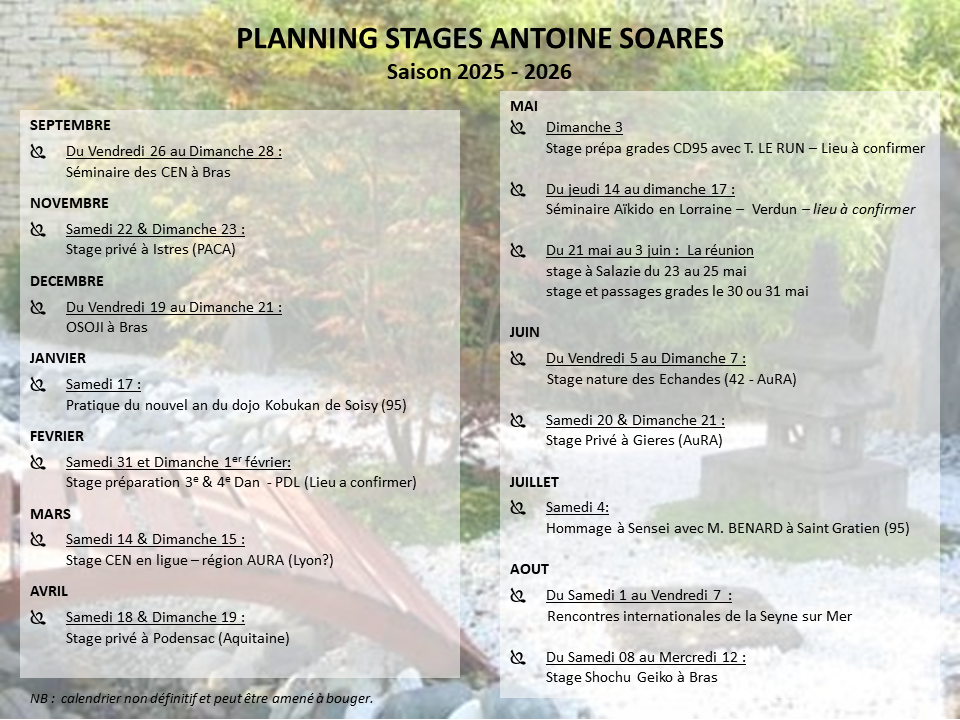 Les pratiques du dimanche matin reprendront dès le dimanche 21 septembre à 10h au Dojo de Soisy sous Montmorency Consulter le calendrier du dernier trimestre 2025 ici